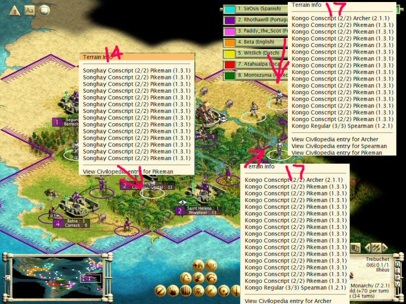 But the real barbarian action came over in Africa. This particular shot came at a time when I really didn’t have too many units over there. The barbs kept wading through my territory with their pikes, and not actually attacking my defense units. I didn’t have too many attack units at the time so they ate up several of my roads and a worker I forgot to move.