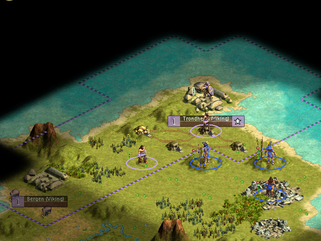Pictured below, in the center on the hill, is a victorious Javeline Thrower that has just taken the hill from an injured Viking Warrior. Just to the north, we can see civilians scrambling for safety, and to the West - additional Viking reinforcements, which will probably prove nothing more than a slight nuisance. To the south-east, you can see the path of destruction left by might Maian warriors on their way to global supremacy.