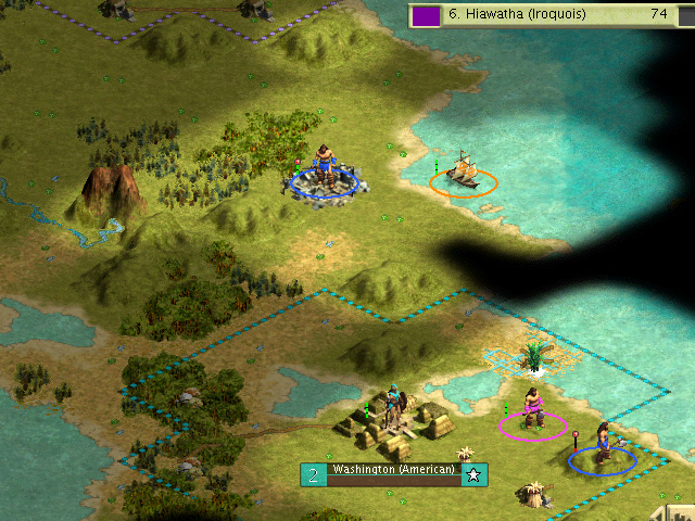 As Washington has apparently rushed a spearman, our attacking warrior, who is already slightly wounded from the previous battle, resorted to pillaging the suburbs untill further reinforcements from our allies arrive, along with the soon-to-be-trained javelin throwers from our own ranks. In the mean time, our warriors have approached New York from the north, as Paddy's boat scouts can probably see.
