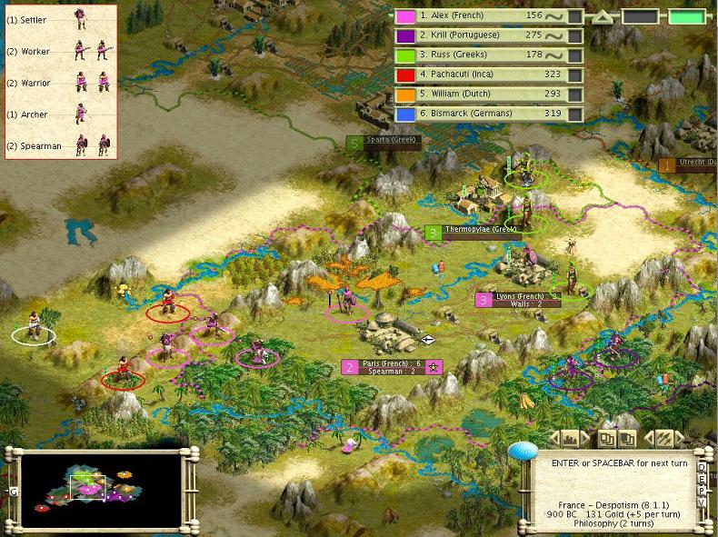 A few turns after that, Russ' Hoplite/Archer pairs showed up and started pillaging as well. Managed to hook up iron by building a colony, and paid the AI gpt for a loan to upgrade 3 Warriors to Swordsmen. All 3 Swordsmen died attacking a single Hoplite.