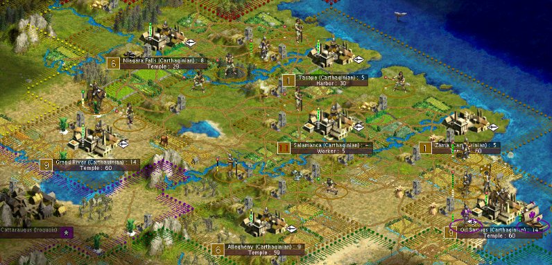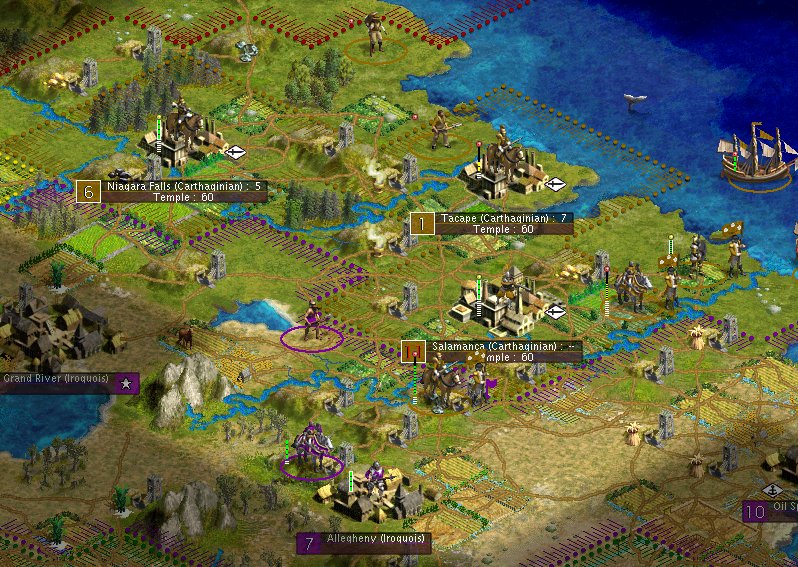 In the north, the first Settlers were given land and the city of Tacape was founded. Brave Musketmen gave their lives and a Cavalry regiment was nearly decimated while keeping Iroquis Knights from killing the Settlers when they were getting out the Galleons. After that atrocity the Cavalry officers decided to tech the Iroquis a lesson in manners. Two hours later the citizens of Niagara Falls found themselves under Carthaginian rule.