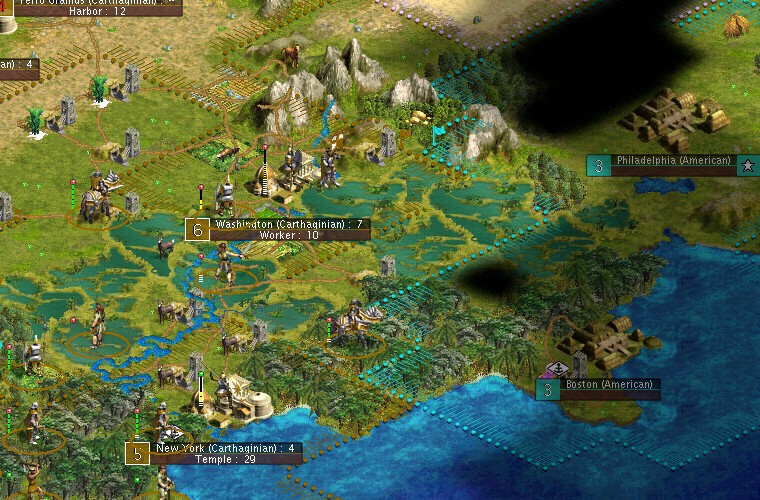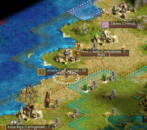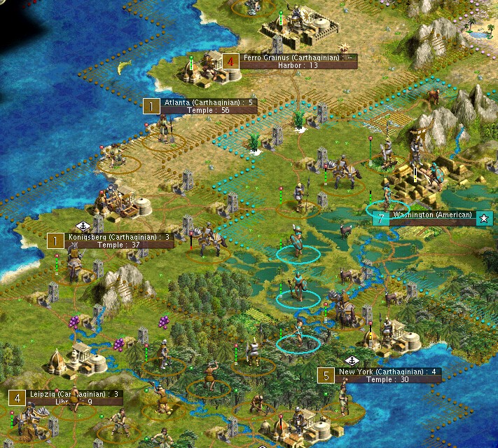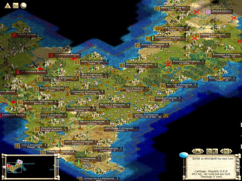 . America is no more, China is broken and ready for whatever you want to do to them. The small army on the Russian border could hurt'em a lot, as they don't have pikes yet. A couple suicide Galleys lost, one on her way to a presumably good starting point for going west. Red crosses are, of course, planned cities.