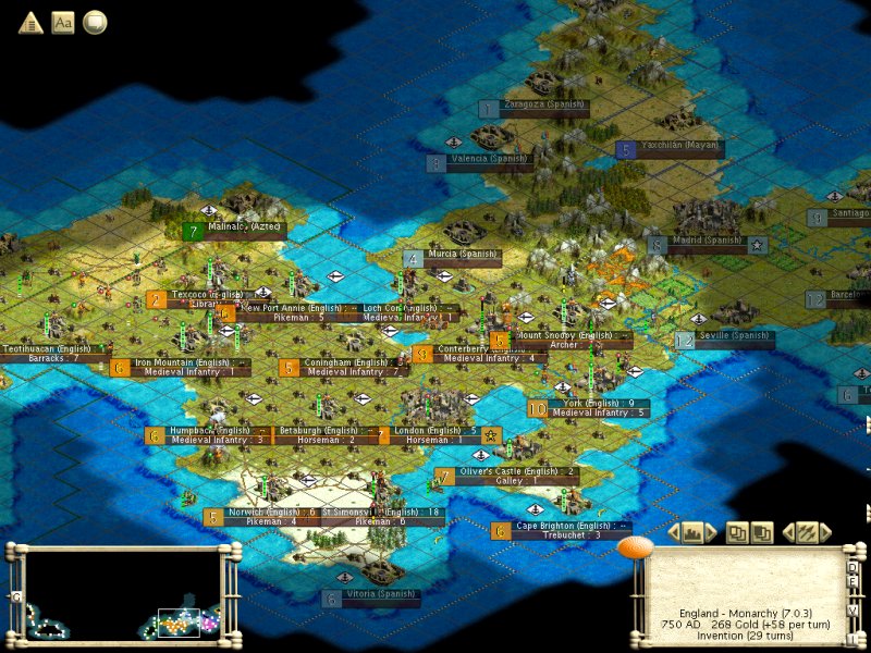 4/5 MI kills pike now 1/5. 4/4 MI kills 2/3 spear, 3/4. 3/5 MI kills 2/3 spear, and Takes Texcoco!!! along with 9 (nine!) workers. I go ahead and keep the city, might as well. One Swordsman outside killed by 2/4 MI now 1/4; 2/5 MI dies to 3/3 MI outside (bad luck, ah well)... but we hold Texcoco with a good sized force. Now perhaps Peace with Aztecs will be possible in the short term, allowing a war with Spain?