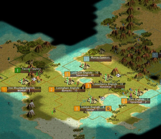 18. 1075BC-Inca land a 3 HP warrior outside of York. I only have a 3 hp warrior in York and the Spanish are blocking the York to London road so I make peace and trade the Inca writing for 24G (ATH)
