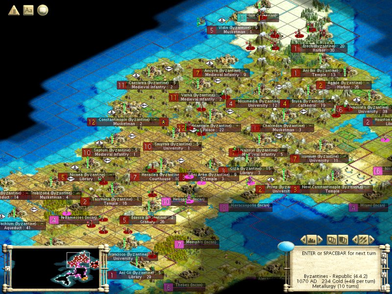 AD 1040: Retook Nicea. Made peace with Spain for 80gp. Sold them iron (which they don't really need, with conquistadors) for 45gpt, which we do really need.
