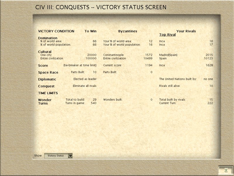 Good luck, (insert-successor-name-here). Apologies for the lack of tech lead ... but I did what I could Inca and Spain just kept advancing tech faster than I could, even when trying to get techs they didn't have ... *sigh*