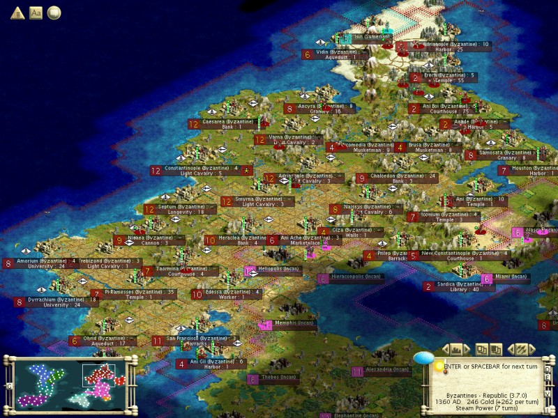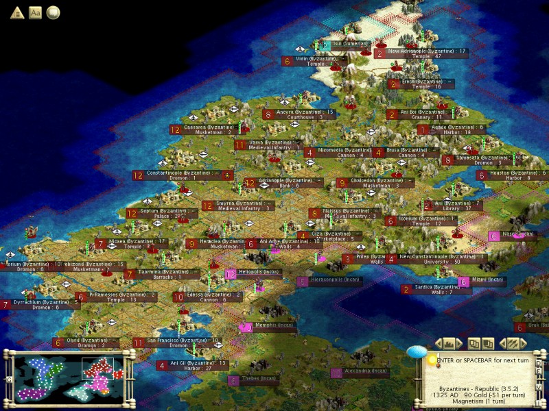 The plan: get into the Industrial age, while preparing an invasion. Research Theory of Gravity, buy/exchange for Magnetism. Then, poke the Inca in the eye, and get any technology available. Consolidate Byzantine lands in the process. Perhaps start the Golden Age at the same time. The danger: the Inca might attack before we're ready, and they have a very big army.