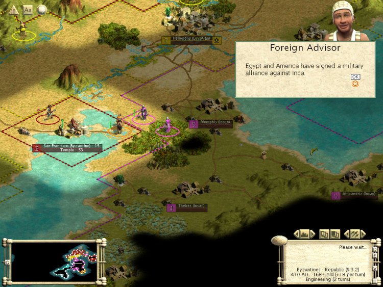Just got to the game. I can see Byzantine Republic is in peace, that is a good thing. I wonder what chance do we stand for completing Sun Tzu's Art of War? Spanish and Americans are building it. We could use some Wonder of the World.