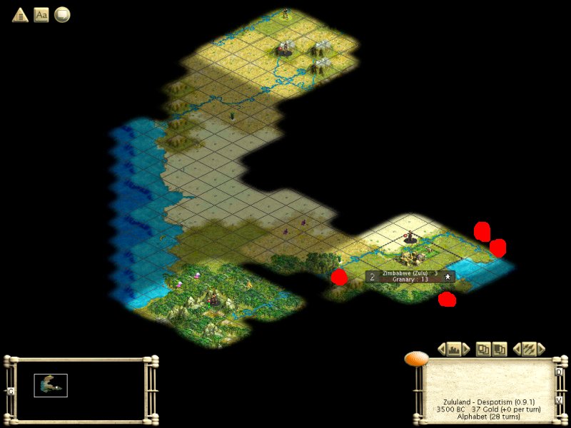 3950: Scout finds a hut, next turn to pop. Build Zimbabwe; start Granary right away. Large map + Expansionist = no mil units needed yet. 30 turns to start with.