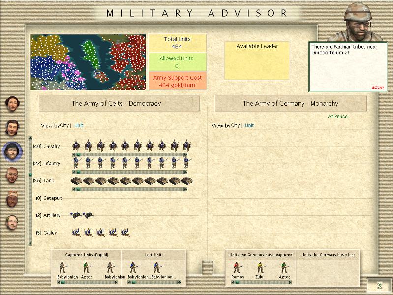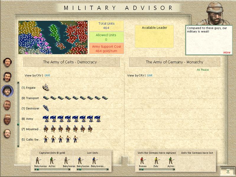 The Aztecs launched an incredible counterattack on the City I just sieze on the Northern Island. The city was being defended by 19 Panzer Units. Riflemen, Aztec Warriors, Swordsmen, Med. Inf., Knights, Mounted Warriors. Over 300 units involved in the counter attack. The Panzers faught brilliantly! The nearby ocean is running red with Aztec Blood. Aztec losses had to be well over 150 units! An unbelievable battle! Alas, The German hero's eventually succumed to this incredible onslaught and the Aztecs reclaimed their city. Never in the History of this world could their ever have been a display of such gallantry by defenders and such reckless and determined attacking by any nation!