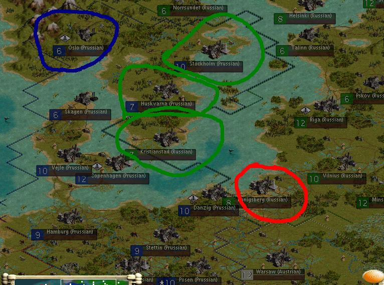 Lord Iron Jackson you will return control of the Prussian port city of Konisberg (circled red) to the Prussian people, you will retain control of Kristianstad (circled green) which is the second Prussian city you have captured. Further as a gesture of goodwill Lord Bongo will cede control of two further cities to the Russian people, Huskvarna siezed by thr Prussians from the British and Stockholm (both circled green)