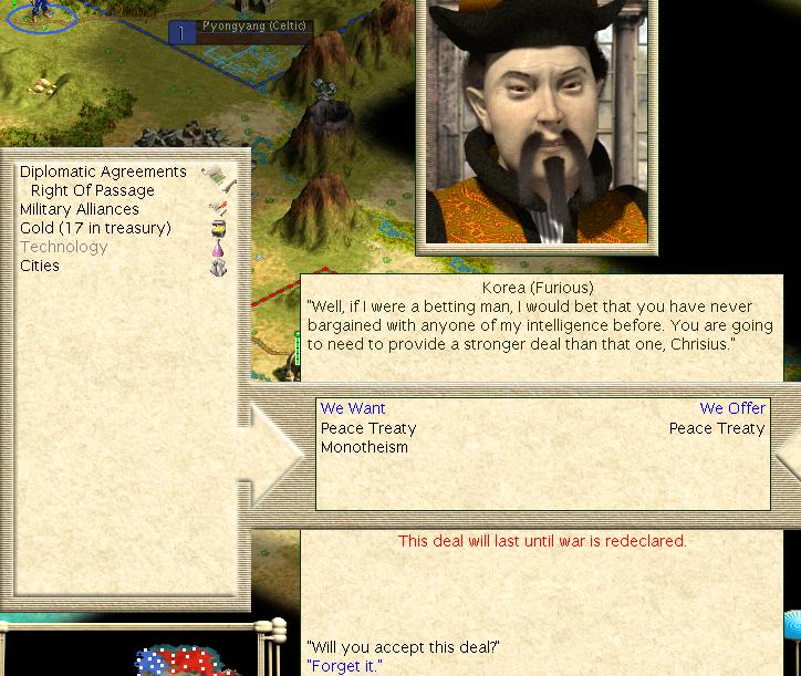 How stubborn are the AI since conquests. Korea has been smashed from a fairly big 9 or 10 city state with a slight tech lead, down to a 2 town endangered species.