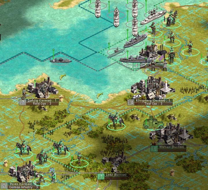While Hindenburg prepared for the defenses around Posen, his no. 2, Gen. Ludendorff plans once again, for the Battle of Memel. Ludendorff is also responsible for Königsberg, whose garrison is quickly dwindling. The battle begins once more at sea, where we still hold the advantage. We blast their ships and their troops inside. The charge to Memel by our Infantry and Cav makes a sweeping move to the east, in an effort to cut off the Russkie Infantry. Like the previous battles, this one turns into a street battle from buildings and houses.