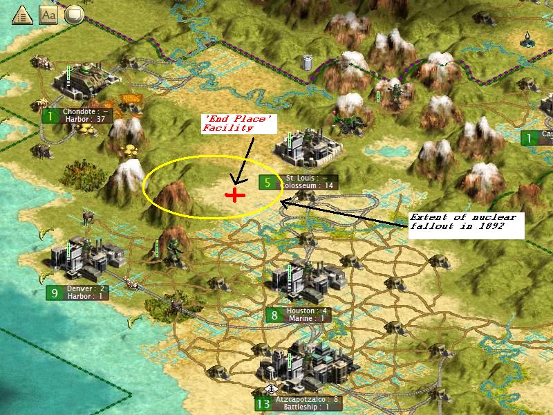 This cap shows the location of Hixalz's facilty and the site of the first use of nuclear weapons in battle as well as the resultant damage from the blast