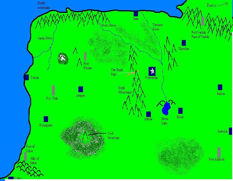 “We shall split the Immortals into three forces and one command force, which I shall command. The three forces shall be split into smaller units. The objective is to take complete control of West Persia where we can raise an army and begin preparations for the oncoming offensives from Russia. Your force is to wipe out every Russian man in your area. I want you to cleanse every village, town and city.” He then pointed at the map, “The three commanders of the three forces shall be Borio, Emir, and Belisarius. Belisarius you will start by striking Fort Medes, first strike the villages and towns and clear them of Russian. Then strike the Fort. Do not allow any messengers to escape if you can will it. Emir, your sector is around Aleppo. Once you take Aleppo clear out the villages in your sector. Borio, you shall strike at Pasargadae. Remember, throughout the countryside you will wipe the enemy out, then your final strike shall the city or fort. I will lead my force to hit the city of Tarsus immediately. Then our armies shall move their way towards Fort Trilo.” His forefinger fell on top of the fort on the map, “This fort is unlike the areas that you will strike, it is defended well…more so than either city. We will gather then strike at the final remnant of Russian invaders in the west.” They all nodded in agreement.