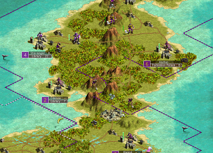 A few turns after the Scandinavians attacked, the Romans joined in. They moved their Legionary and Archers as well as Legionary/Settler couples into Chinese territory and plopped down cities. The Chinese region bordering the Romans was largely newly settled and the Romans promptly invaded a few 1 pop towns and replaced it with their own towns.