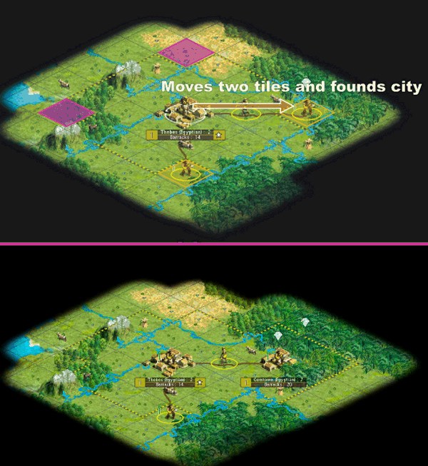 This is the procedure I developed to quickly farm off a city or two and not lose any tile usage while doing so. It requires the construction of roads up to and including the next city site. Once you have chose the site and have been able to complete the settler. It move two tiles on the prebuilt road and then uses its remaining third of a movement point to settle the new city.