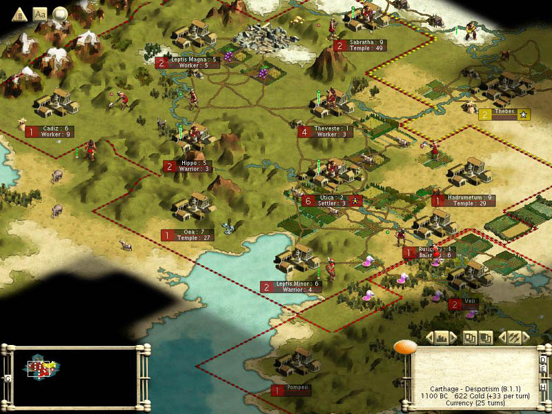 That patch of four Cattle is just ridiculous. I'm using three in my capital of Utica, which allows for a Warrior and a Settler every 4 turns. The Grassland Cattle is being used by Theveste, which (in the screenshot below) will soon be a 2-turn Worker pump. I plan to make Utica a 1-turn Worker pump once I hit Republic.