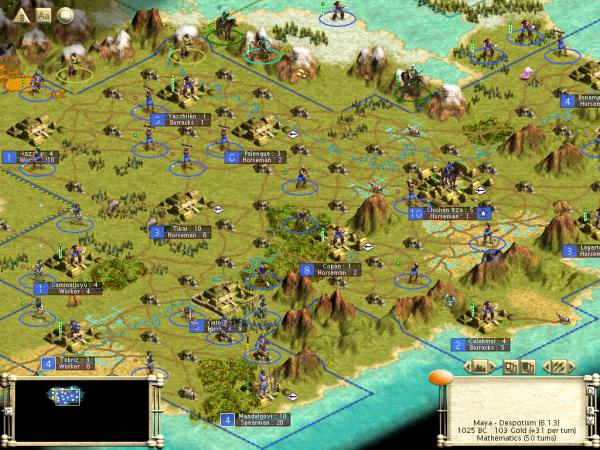 This time I took out their Iron the first turn, and a size 12 city the 3rd. Things were looking good. That is, until the Japanese declared war on me out of the blue. They had built Zeus, and had at least 15 units in my territory at the time, about half of them were Ancient Cavalry. They had been sending their units to attack a Spanish city up north, and made peace with Spain before they got there... figured as long as they were here...