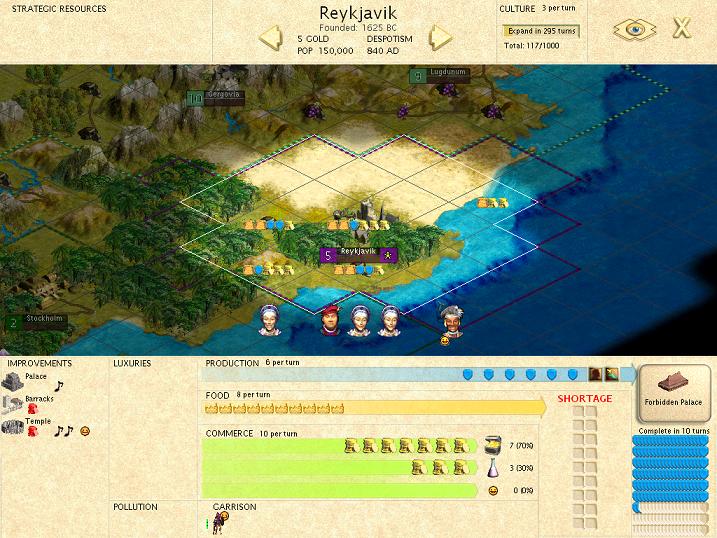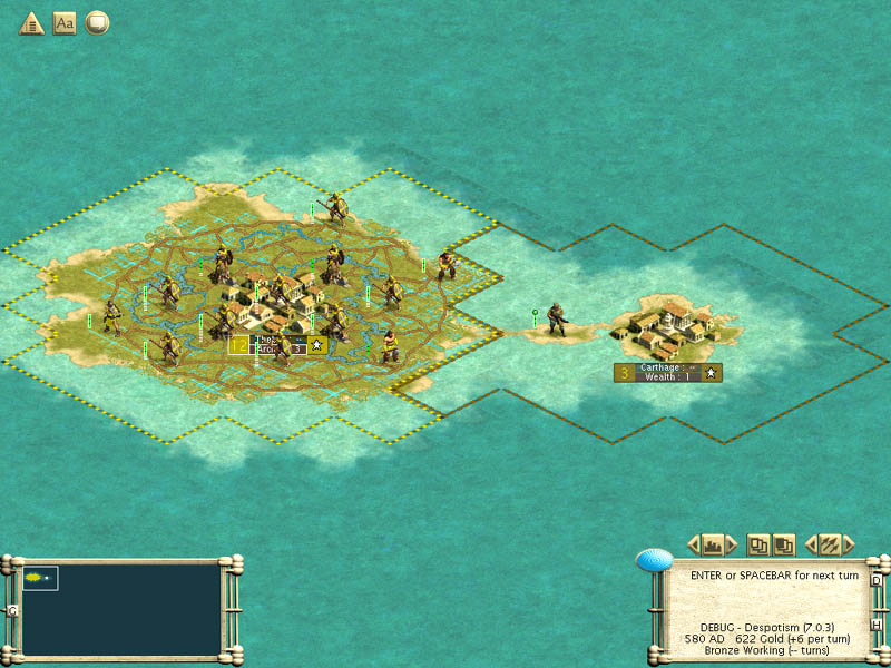 2. In the same scenario, the AI never built a Worker! It used the 2 it started with (Emperor level) to improve all the tiles, which took quite some time. I guess the AI obeys a limit on the number of Workers per city.