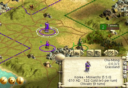 Here's the situation: You are Wang Fred, King of the Koreans, caught in a scenario mid-game, Monarchy level, in which you are trailing most civs one way or another, but certainly still in a winnable game. You have been in a war that bogged down with the Romans, for supremacy on your (smallish) continent. To your east, the Aztecs and Germans have spread across a larger continent. Monty built the Great Library (I know, I know, it seems unlikely.) To your west, a larger continent holds a series of more advanced civs, apparently well along in their Middle Ages.