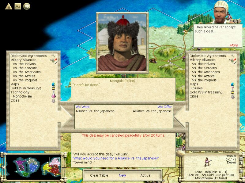 There's a mountain range that runs South from just West of Xinjian/Hangchow all the way to the other shore, pretty much along the Mongol-Japanese border. Blech.6. Will the conquest of Mongolia open up a better invasion route to Japan? From the map you posted, you have 2 easy city captures (Nagoya, Izumo), one tougher one (Kagoshima - though it is isolated and small) and then you have to cross a nasty mountain range to get to their core. But if you were coming from their west... is there a flatland route to Japan's soft underbelly? If so, perhaps Mongolia should be your first target.
