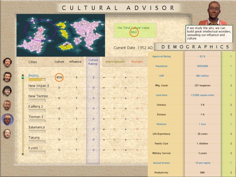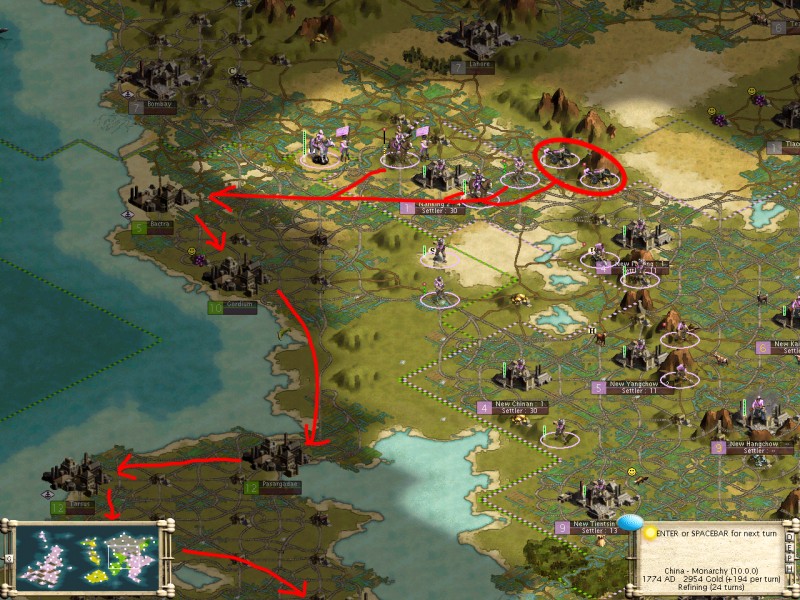 Having spent money to hurry artillery units in many of his cities, Mao massed together a multitude of artillery that he used to beat infantry down and kill of the rival civilians to make the cities become towns quickly. After having laying siege to the cities and wearing them down, his cavalry and armies of cavalry found it easy to quickly dispose of the weary units left, thus minimizing his losses.
