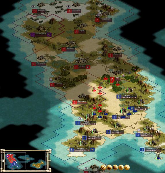 A couple centuries later, Rome is still second banana in the world as it seems, and with a larger army, Rome again starts moving into Babylon territory where by I again tell Caesar to "leave or declare war" (we all know what large masses of units moving towards your land means) and he says, "so be it, war it is."