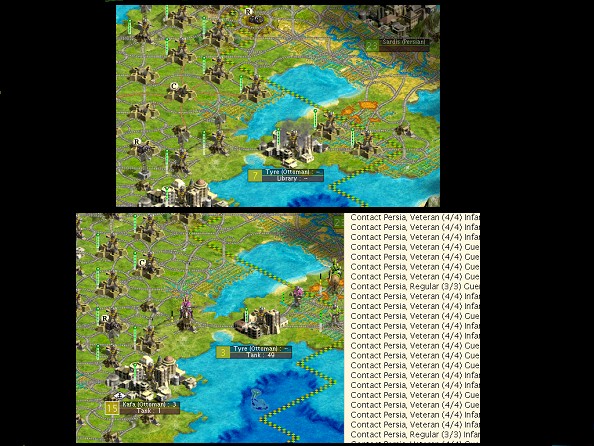 ). But my diplomacy was ineffective -- I found the Ottoman empire embroiled in several wars, and even with Universal Suffrage my Republic began to feel the strains. I constructed a longish maginot line before I finally decided to take a Persian city to encourage negotiations and also significantly shorten the needed maginot defenses.In the age of infantry and tanks, just after entering the Modern Age (I had a 3 - 4 tech lead and no one except the Ottomans yet had tanks) I took Tyre from the Persians. I intended to build fortresses and staff them in the appropriate spots to insulate my new territory from incursions. After taking Tyre, but before I could build the defensive fortifications and attend to some pollution clean-up, I stepped away from the laptop and fate intervened. I returned to find a guilty but happy child and a screen that clearly showed that my turn had ended and the AI had moved -- a good-sized SOD waited outside my new city, and a dozen or so wounded and "retreated" cavalry were nearby -- I had also lost some key assets. I reloaded the turn, played it out as best I could as I had done the first time, but completed my planned fortifications and posturing. When I ended my turn, I was quite surprised to see not one whit of an AI SOD -- I suffered an aerial bombardment or two, but my maginot line was unmolested!