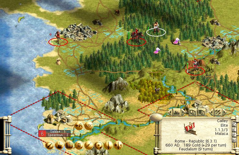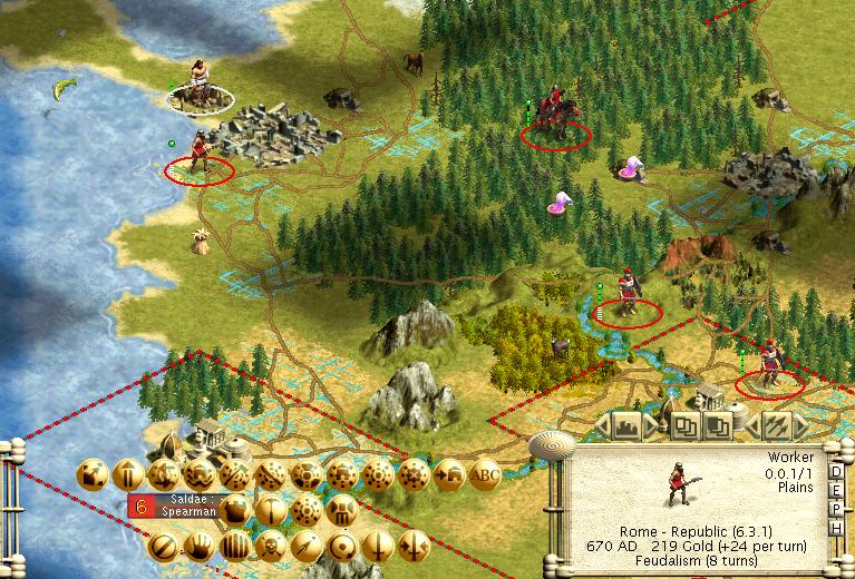 However, I am in the middle of my first real go at a Monarch game, playing as the Romans, and I have just seen a Barb camp spawn next to a stack of slave workers I have! I am posting the before save. At the end of this post should be the save. Go and have a look at the stack of slave workers between Malaca and Saldae in the far NW of the continent.