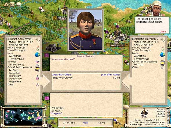 2) It is not a smart trade, but France will give up Atomic Theory now if asked, for only Steel, a World Map, 2481 gold and 24 gold/turn. Accept this deal.