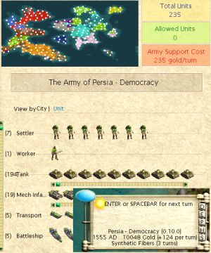 I played up to 1555AD last night, mostly just building up tanks to upgrade to modern armor when the time came. I took advantage of some wars on the other continent to establish a foothold. The AI's in this game have all been completely psycho. I don't think there has been a turn of peace for any of the AI since the advent of nationalism.