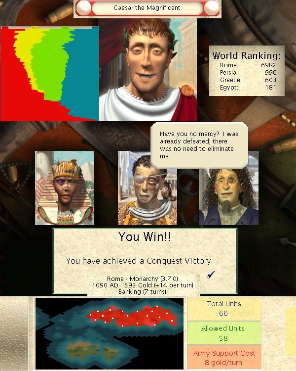 I let the Egyptians hang around a bit longer, just milking their WC's and Archers for more leaders, while fighting a defensive war with Greece trying for the same thing. Once the next leader was generated I built an army, and captured the last couple of Egyptian cities.