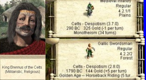Information thus far indicates that The Celts are a Religious and Militaristic civilization. This means that they begin the game with Ceremonial Burial and The Wheel or Warrior Code. Their UU is The Gallic Swordsman and is most likely available with the discovery of Iron Working. The stats of this unit are 4.2.2 (attack.defensive.movement) which appears to make this unit the most powerful offensive ancient era UU. This unit will have the Mobility and retreating ability of "fast" units and the Offensive power of Immortals, Knights, Elephants, Samurai, Raiders, or Medieval Infantry and will most likely cost the same or slightly more then the number of shields required to make a "Vanilla" swordsman or a Roman or Persian UU. This means that the Celts will have a unit almost as good as knights and elephants (and only a bit worse then Samurai and Raiders) many many turns before Chivalry is discovered. Looking at the cost of the "Vanilla" swordsman we see that it is 30 shields. If the Gallic swordsman has the same production cost then it is possible to produce 2.1 Gallic swordsmen for every Knight or Knight equivalent your opponent produces.