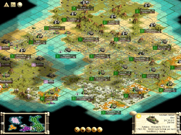 Egypt's original peaceful expansion took it west as far as that inland sea; to the north was Rome, which never got fully untracked because it was my only neighbor, and therefore the civ against whom I waged periodic war throughout the ancient era. The western half of the continent was split horizontally by the Iroquois and the Americans to their north. At one point, the Americans were as strong as Egypt, but declared war against the Iroquois, and were jumped by everybody (I took two cities in my rear). You can see their one and only city on the world map, on that island to my northwest. After Egypt took Rome (minus my piece), their holdings - which included half of what was once America - gave them a definite edge over the Iroquois, and a huge one over me. They also have the world's best culture, which is why I expect to keep only their smaller cities, and resettle the rest of them.