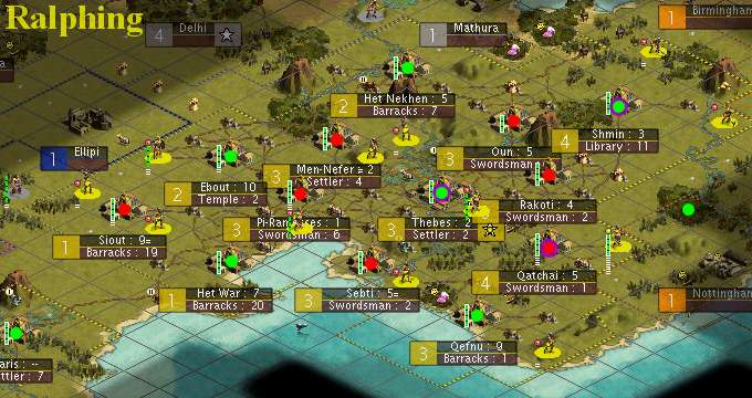 In the Ralphing game, my expansion looks like it stopped at about the same time as the 3-tile game, but at that point, I was better equipt to go to war. I upgraded my warriors to swordsmen (thanks Dominae), sacked a city and captured Paris giving rise to the placement of Het War and Siout. Just before the picture, I'm about to declare war on England and annex their territory.