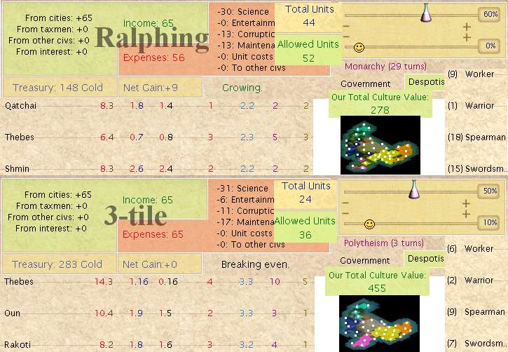 The screenshots are pretty self explanatory. You can see that the main difference in the two styles is that Ralphing gives you many more units and free units (at least in despotism and monarchy) while the income from the cities in both remains the same though Ralphing yeilded me 14 cities compared to 3-tile's nine. 3-Tile allowed larger cities and more production per city while Ralphing garnered slightly more overall production.