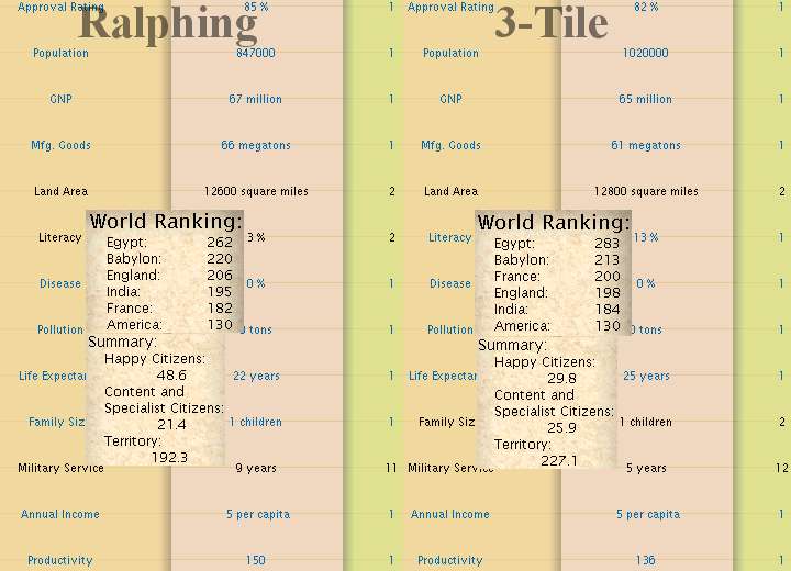 One other interesing aspect was how I was able to get 14 cities when Ralphing in the same time I got 9 from 3-Tiling. I think for the most part it's because the camp cities only build barracks, military, workers and settlers whereas in the 3-Tiling, I was more likely to switch to a temple or library as needed.badams