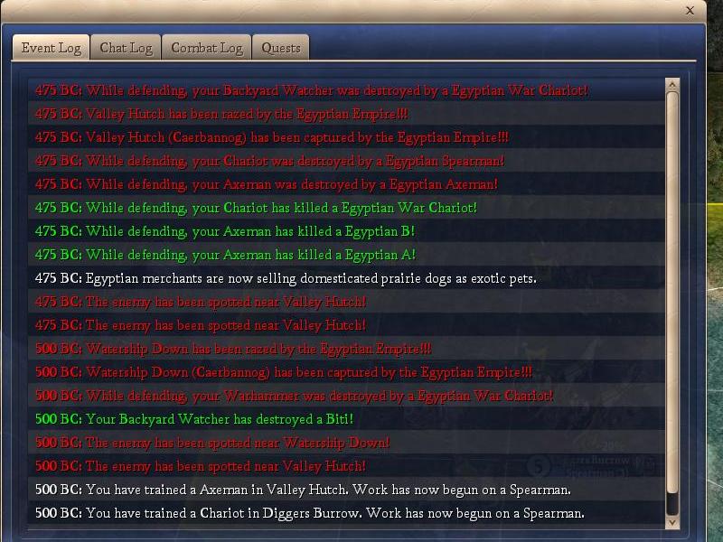 They took out Watership Down, and moved an army next to Valley Hutch in 500 BC. Probably not long before the timer lapsed because the last time I checked, there were less then 12 hours left for that turn. At the onset of 475 BC (the turn has 40+ hours to go as I type this) they attacked Valley Hutch with the moved army and lost 3 units for our axe defender and chariot. They then conquered and razed the city.