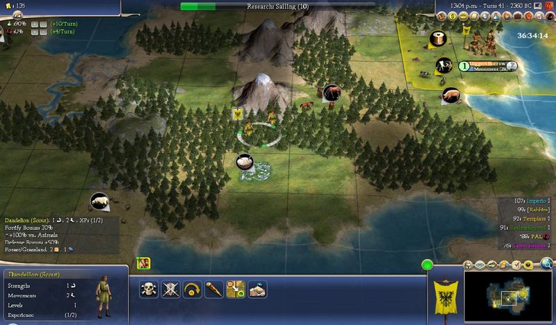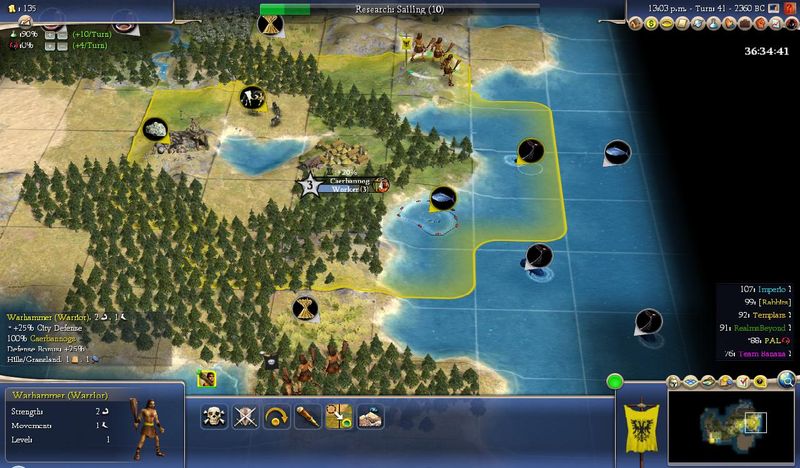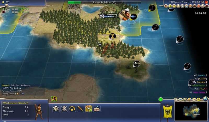 We're obviously in the stage of the game where the barb AI "warns" us with barb warriors appearing and disappearing from view. I think this particular barb won't attack for a few turns yet. If he disappears next turn, we could let Warhammer scout to 9. If not, he can return 2 turns ahead of the barb warrior.