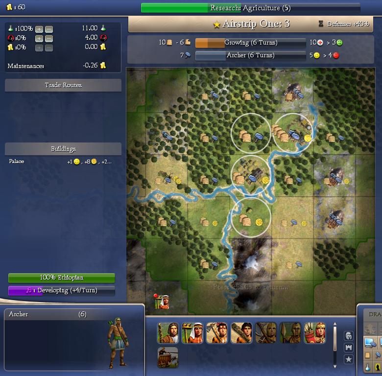 We have 3 mines and a cow pasture, and worker just finished Mine+Chop, so 2nd worker will complete next turn. One of our warriors is protecting the worker near capital, while the other two are escorting settler: