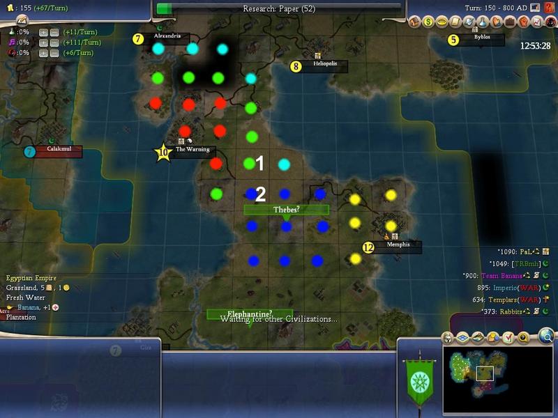 T50: The Warning 3rd ring. Grabbing 5 new tiles.(cyan). Now, IF Thebes was not on that hill, but on the southern city site, The Warnings 3rd ring would gain 6 new tiles. The tile marked "2" however is already taken by Thebes. Therefore only 5 new tiles.
