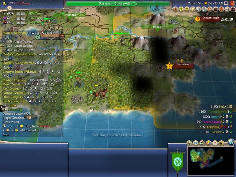 One quick suggestion for sunrise (I know there are like a million pieces of advice already floating around this thread!) Let's try to move our scouting chariot to get visibility into the Imperio city that mh has marked with a sign. It's a slight detour north, but will be useful for C&D purposes. Imperio looks like they're going to miss the current turn, so their uberstack probably isn't going anywhere right now.