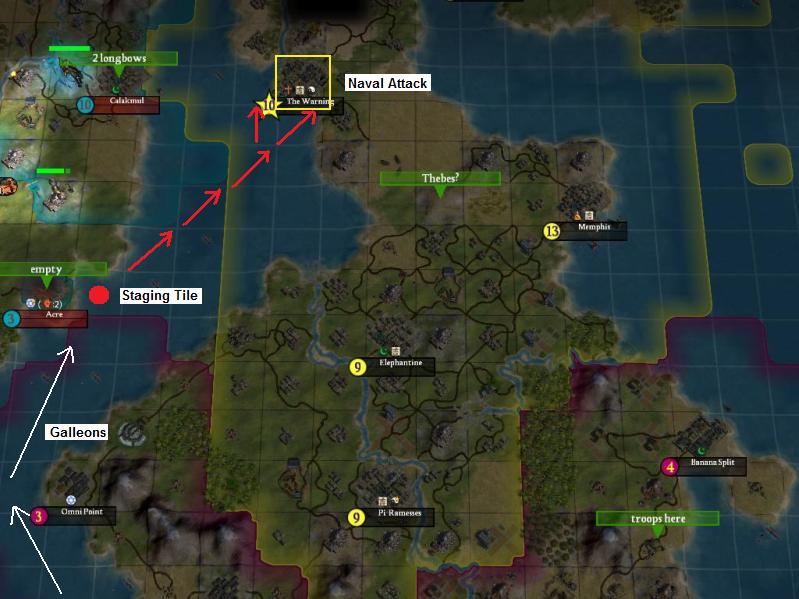 Donovan, here's the screenshot we were talking about last night, just to be clear on everything. You can move to two different tiles at the end to attack The Warning, so it should be tough for them to block you with any naval units. Remember, goal is to be on the red dot tile on T172 (with the full two galleons + six units), attack on T173!