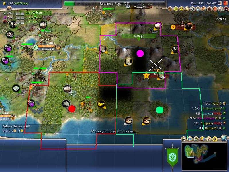In either case though, I think we're better off razing and replacing Jerusalem. There are no shrines in there, remember, and frankly not much infrastracture either. We get a better city by moving NW, better spacing with our other cities, and a more defensive location. And yes, Jerusalem is a double holy city, but again there's no shrines in there! (Stupid Templars.
