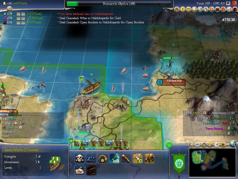 I swear, this attack could NOT be set up any better. Free worker for us to capture at Chichen Itza! I moved the galleys/trireme up to Chichen's doorstep, but that was it. I didn't move the Mounted stack, didn't want to make any mistake there.