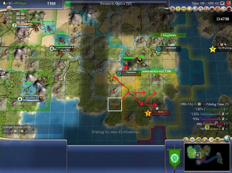 Our workers move SE and build a road on the tile where our military stack is located. Our units can then move along the former Templar road network and then hit Acre, Damascus, or either of the tiles from which Imperio is likely to attack. It's the perfect spot from which to backstab them! And if Imperio doesn't capture Acre on T168, we simply wait a turn and execute the plan on T170. This tactic is nicely flexible in that regard. We simply have to move the galleys in the north to the Imperio border on the turn that we expect Acre to be captured (this will likely be obvious, thanks to our chariot scout).