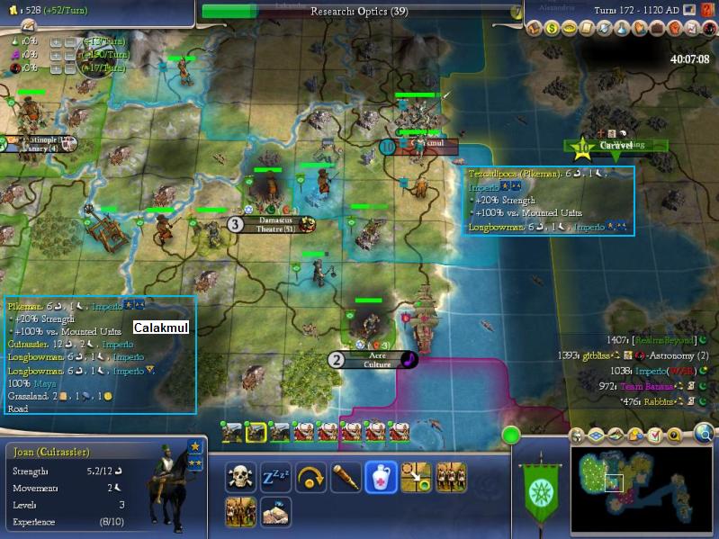 - Our main stack moves NE next to Calakmul, with the now-healed units moving up behind them onto the same hill tile they vacate (1E of Damascus). I think we can also send the two Oromos (Lou/Mamie) forward with them, as the injured units from last turn (Adria/Barbara/etc.) will pile into Damascus to heal. Along with the longbow and pike in there, we're set against anything reasonable Imperio can throw at us. Our reinforcements will also move up onto the hill 1E of Damascus; it should be quite crowded there! Bombard the defenses down at Calamul next turn (T173), city captured the following turn (T174). No walls, so the defenses will fall quickly.