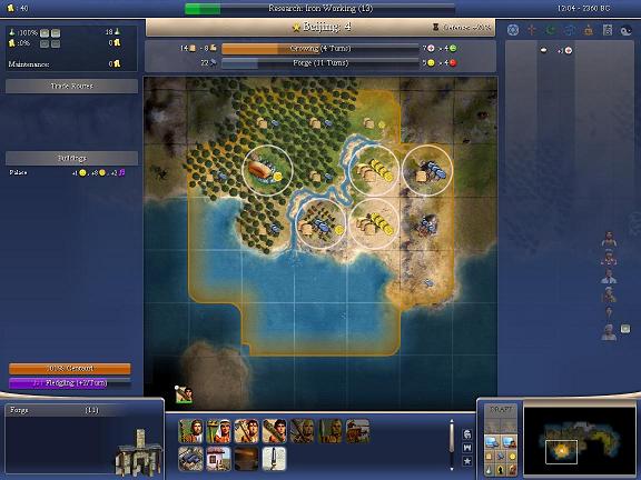 What's our happy limit in the capital now? 5? I presume we have plenty of health between the river and forest, even with the forge. Might as well compare the case of whipping 2 pop (next turn or the turn after) as a case C (and maybe D). What are our build options immediately after the forge, anyway? We could make a lot of headway towards a Granary with the overflow, plus the presence of the forge.