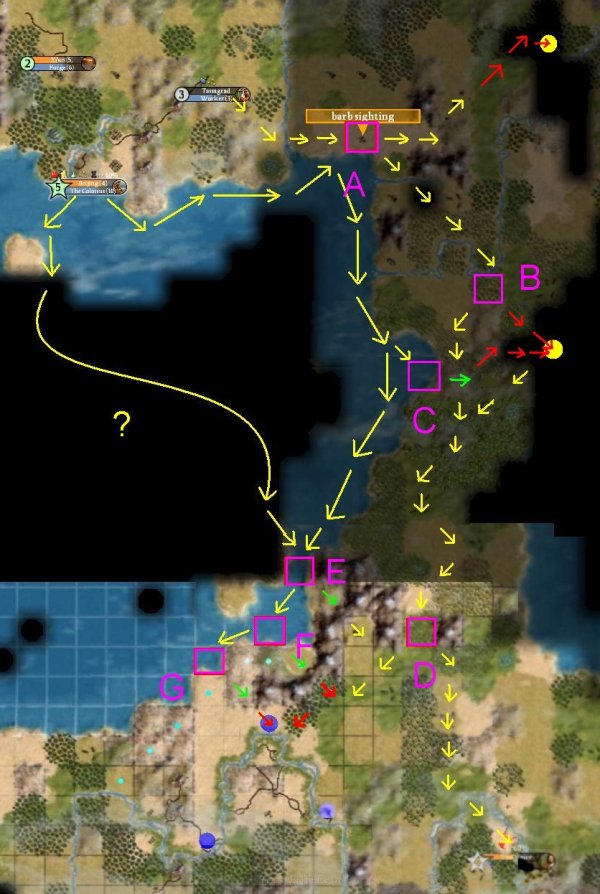 I've done a very slick route plan focusing on the fastest paths to critical tiles ware we need to make important decisions. The key plots are magenta squares and are identified by Letters. The paths are in yellow arrows, navel routes assume 2 movement galleys and no roads, adding roads can considerably speed up the units in several areas. Red Arrows are those inside an opponents cultural borders and thus require a state of war / open borders to pass through.